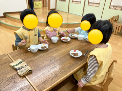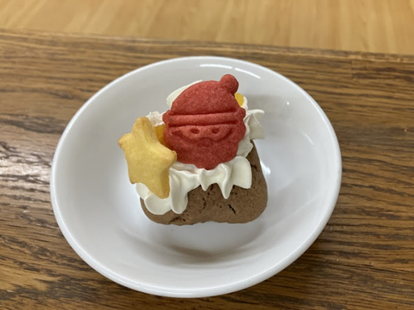 これでクリスマスは終わりかと思いきや、おやつにはケーキが🍰なんとココアカップケーキの上には生クリームとサンタさんの形をしたクッキー🍪「見て、ここにサンタさんがいるよ😍」「美味しい😋」と満面の笑みを浮かべ、幸せそうでした💕